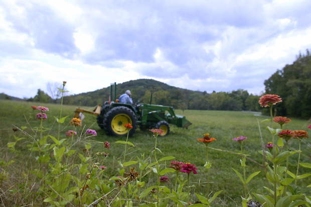 On his John Deer tractor Berkemeyer heads to a section of Frene creek on his property where he picks the perfect rocks for his wife’s rock wall.