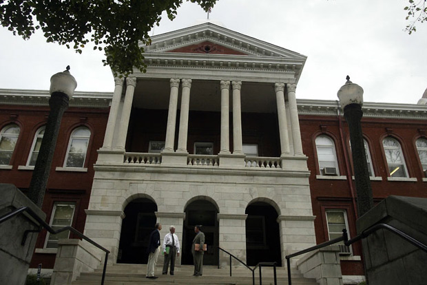 Between weddings, Berkemeyer stops to talk on Gasconade County Courthouse steps with Hermann attorneys Dennis Barks (left) and David Hoven.
